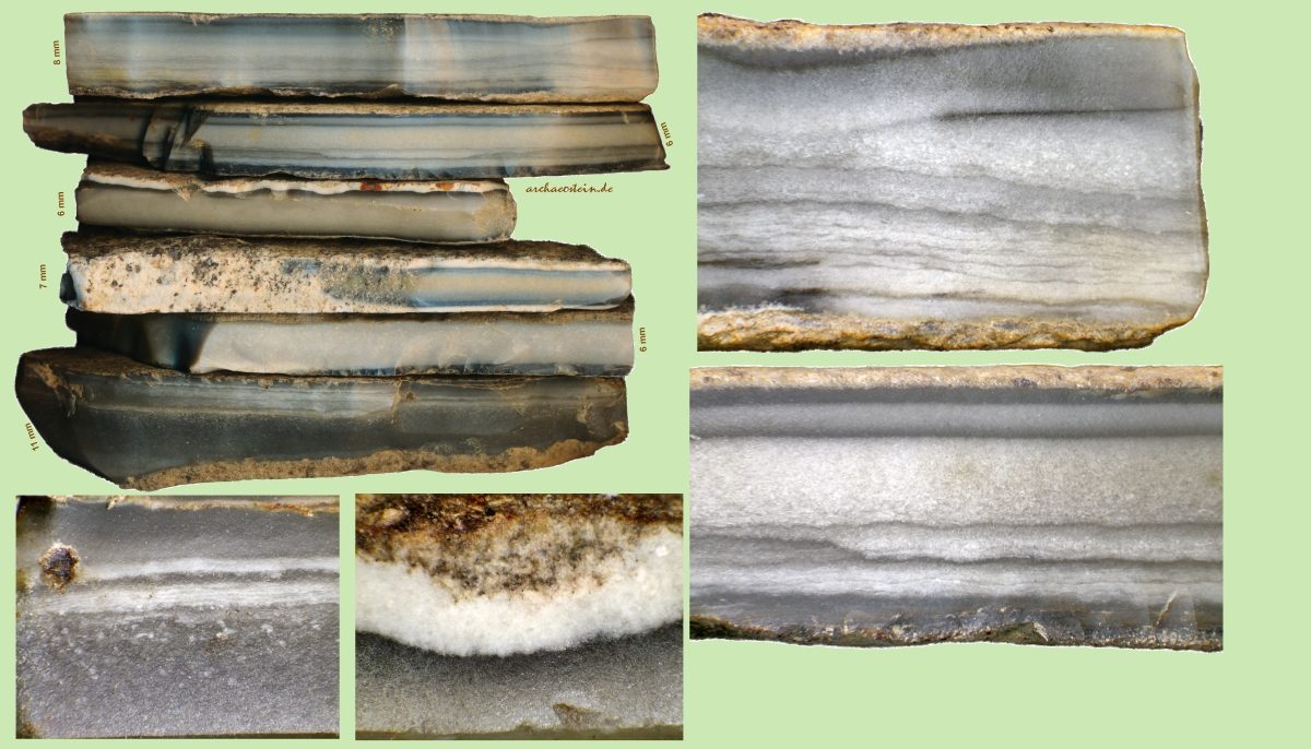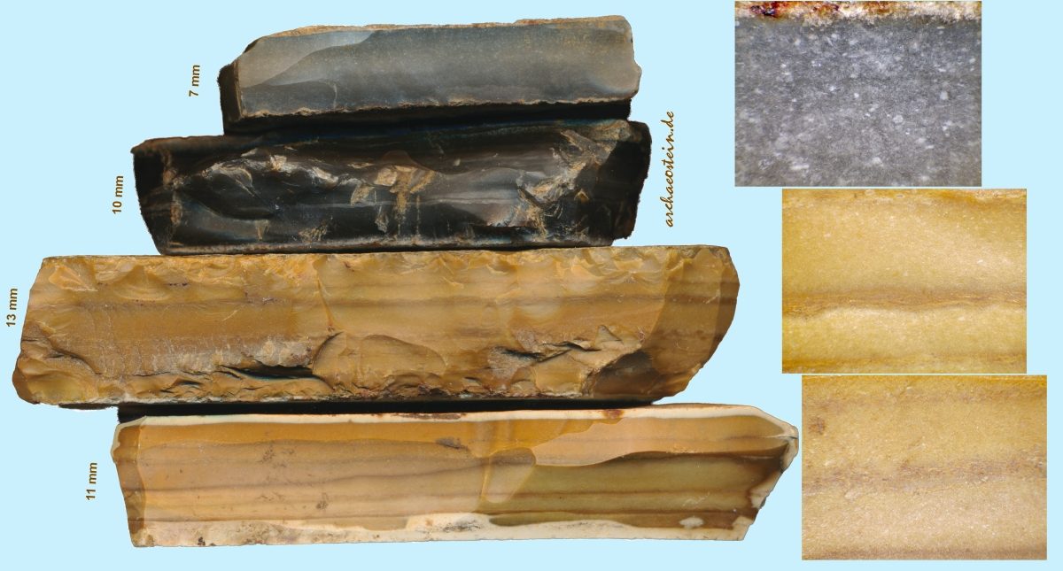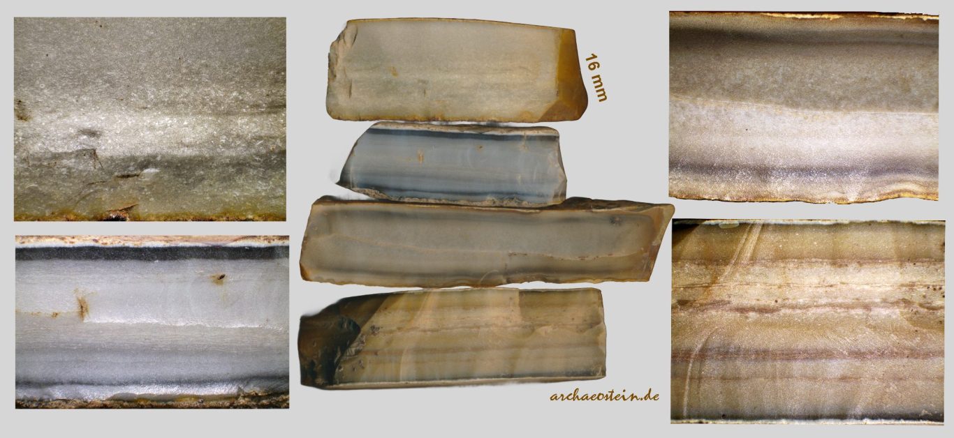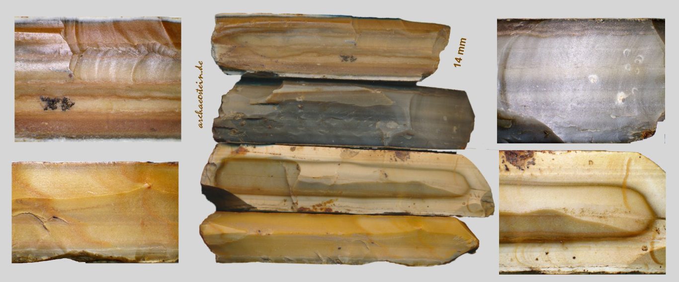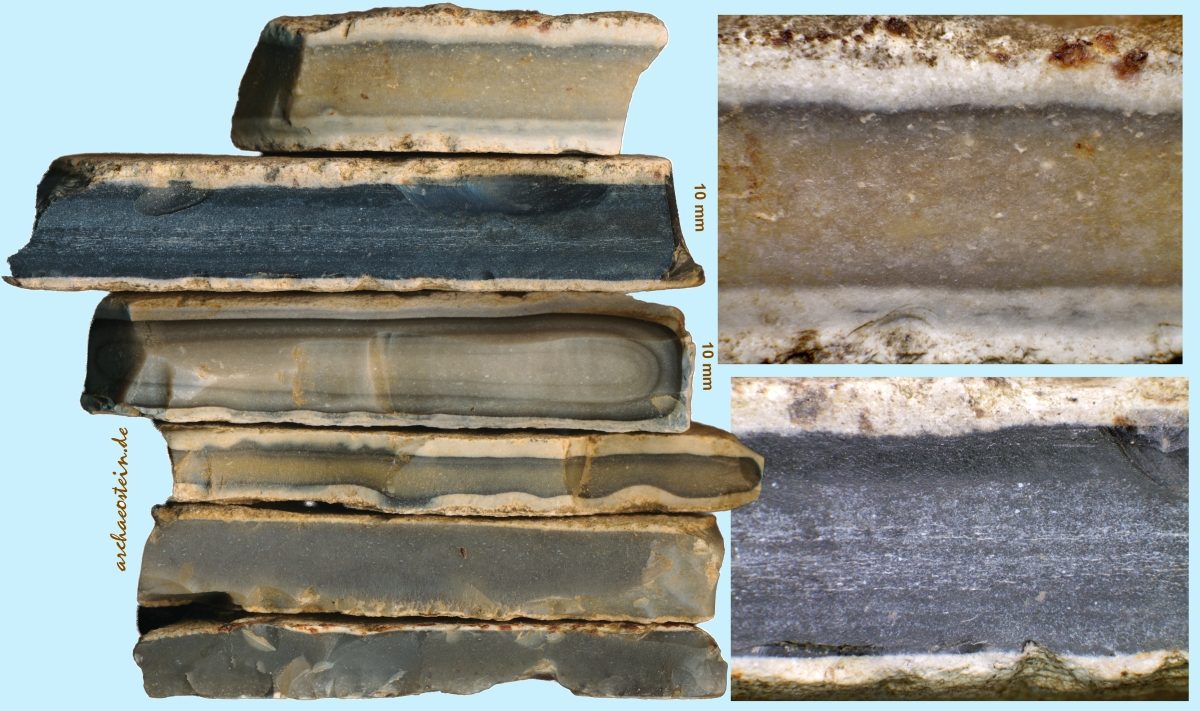 Auf den folgenden 5 Bildtafeln ist der Variantenreichtum von Plattenhornstein aus einer Fundstelle, einer neolithischen Siedlung, ersichtlich. Diese Siedlungsfundstelle befindet sich zwischen Kelheimwinzerberg und Herrnsaal, also nördlich der Donau, etwa 40 m oberhalb Donauniveau. Westlich und südlich davon wurden Plattenkalke der Kelheimer Wanne über die letzten Jahrhunderte in Steinbrüchen abgebaut. Die gezeigten Plattenhornsteine stammen daher auch sehr wahrscheinlich aus den Plattenkalken der Kelheimer Wanne.
