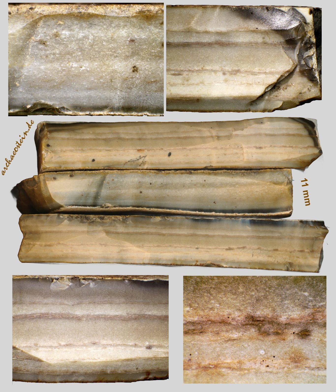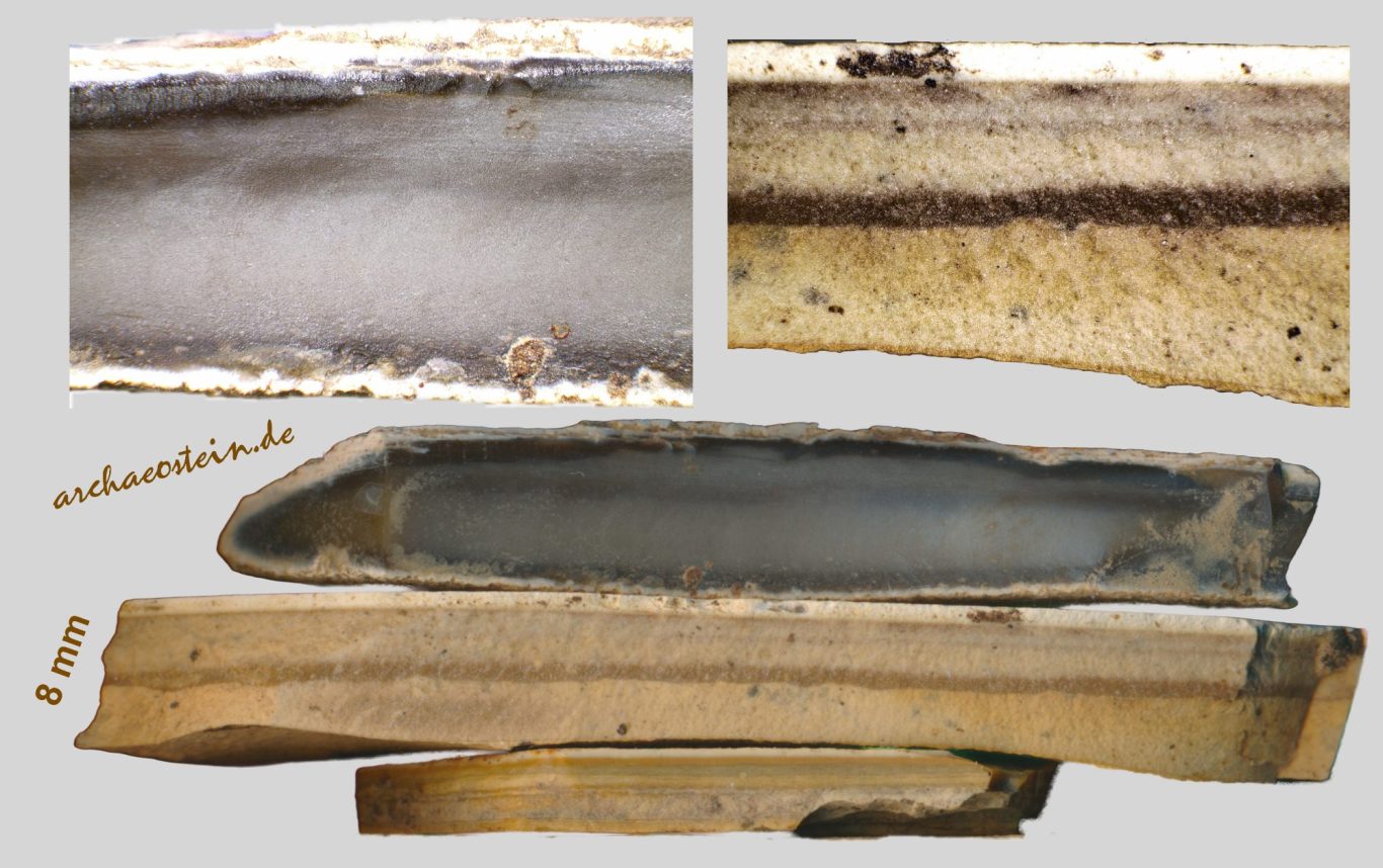 Aber auch auf Hornsteinplatten mit Dicken weniger als 10 mm finden sich Abschlagnegative zur Herstellung von Klingen (siehe die nächsten beiden Bildtafeln). Ob damit das Rohstück nur angetestet wurde oder die resultierenden Klingen wirklich zu Werkzeugen weiter verarbeitet wurden bleibt spekulativ.